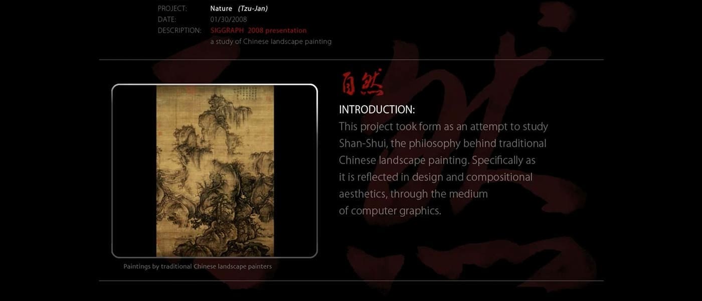 “Nature – Tzu-Jan” was presented during the ACM SIGGRAPH Conference on Computer Graphics in Los Angeles 2008. The technical focus and craft employed to produce ‘Nature’ was Digimatte (short for ‘Digital Matte Painting’), the creation of large scale scenic environments for feature films. The three dynamic paintings are essentially visual effects shots which demonstrate elaborate 3D compositing/digimatte techniques.
